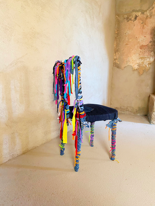 I pezzi della collezione sono realizzati tramite vecchi capi di abbigliamento, nuovamente utilizzati per vestire delle figure di legno. I vestiti, indossati chissà da quante persone, i cui tessuti ne trapelano le storie, si intrecciano fatalmente con il racconto dei mobili. La stoffa si avvinghia al legno con un abbraccio simbiotico che genera l’origine della loro unione.